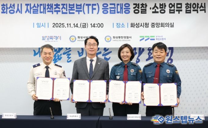 원스텝뉴스 이병희 기자 | 화성특례시는 지난 11월 14일 오후 2시, 화성시청 중앙회의실에서 ‘자살대책추진본부(TF) 응급대응을 위한 경찰·소방 업무협약’을 체결했다고 밝혔다.