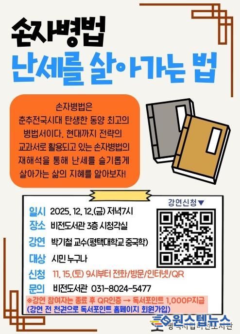 원스텝뉴스 이병희 기자 | 평택시 비전도서관은 오는 12월 12일 금요일 저녁 7시 평택대학교 박기철 교수를 초청하여 '손자병법–난세를 살아가는 법'을 주제로 야간 강연을 진행한다.
