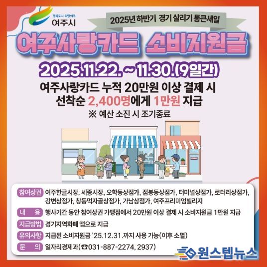 원스텝뉴스 이병희 기자 | 여주시는 오는 11월 22일부터 11월 30일까지 9일간 ‘2025년 하반기 경기도 통큰세일’과 연계하여 ‘여주사랑카드 소비지원금’을 지원한다고 밝혔다.