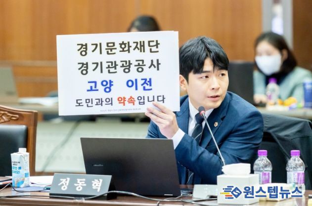 원스텝뉴스 이병희 기자 | 경기도의회 문화체육관광위원회 정동혁 의원(더불어민주당, 고양3)이 18일 열린 2025년도 문체위 소관 총괄 행정사무감사에서 “경기문화재단과 경기관광공사의 고양 이전은 도민과의 약속으로 조속하게 추진되어야 한다”고 강조했다.