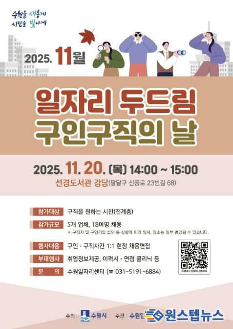 원스텝뉴스 이병희 기자 | 수원특례시는 20일 오후 2시부터 3시까지 선경도서관 강당에서 ‘11월 일자리 두드림 구인·구직의 날’을 연다.