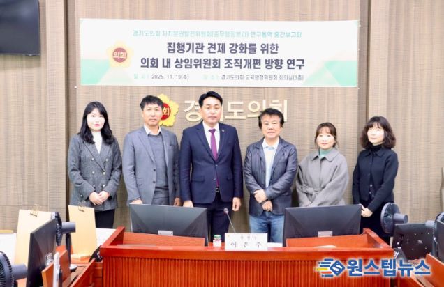 원스텝뉴스 이병희 기자 | 경기도의회 자치분권발전위원회 총무행정분과 이은주 위원장(국민의힘, 구리2)은 11월 19일, 「집행기관 견제 강화를 위한 의회 내 상임위원회 조직개편 방향 연구」 중간보고회를 주재했다. 이번 회의는 지난 9월 29일 열린 착수보고회 이후 연구 추진 경과를 점검하고, 향후 연구 방향을 구체화하기 위해 마련됐다.