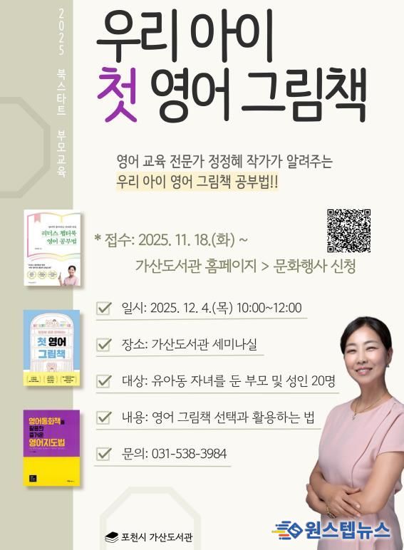 원스텝뉴스 이병희 기자 | 포천시는 오는 12월 4일 가산도서관에서 ‘우리 아이 첫 영어 그림책’을 주제로 2025 북스타트 부모교육을 운영한다.