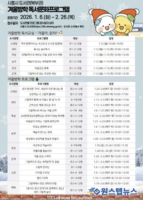 원스텝뉴스 이병희 기자 | 시흥시는 겨울방학을 맞아 북부권 8개 공공도서관(소래빛ㆍ대야ㆍ목감ㆍ능곡ㆍ장곡ㆍ은계ㆍ신천ㆍ매화)에서 1월 6일부터 2월 26일까지 겨울독서교실 및 겨울방학 프로그램을 운영한다.