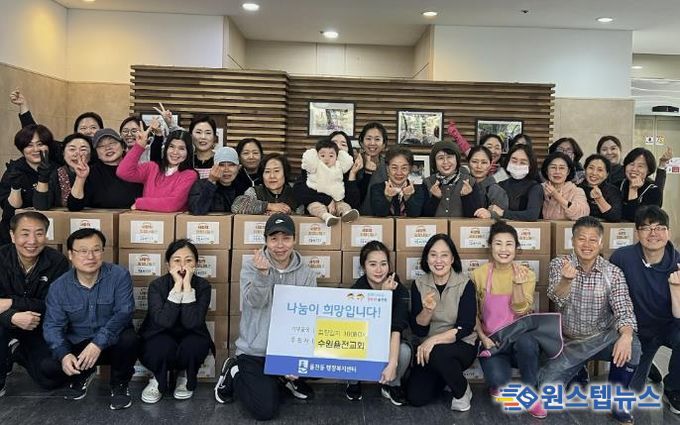 원스텝뉴스 이병희 기자 | 수원시 장안구 율천동 소재 율전교회가 지난 20일 정성이 가득 담긴 김장김치 100박스를 율천동 행정복지센터에 기탁하며 올해도 따뜻한 나눔을 이어갔다.