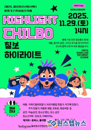 원스텝뉴스 이병희 기자 | 수원시청소년청년재단 칠보청소년청년센터는 오는 11월 29일, 지역 청소년과 주민이 함께 즐길 수 있는 연말 축제 ‘2025 칠보 하이라이트’를 선보인다. 이번 축제는 센터 소속 청소년·청년들이 직접 기획하고 운영하는 참여형 행사로, 센터 전체 공간에서 다채로운 체험과 공연이 펼쳐질 예정이다.