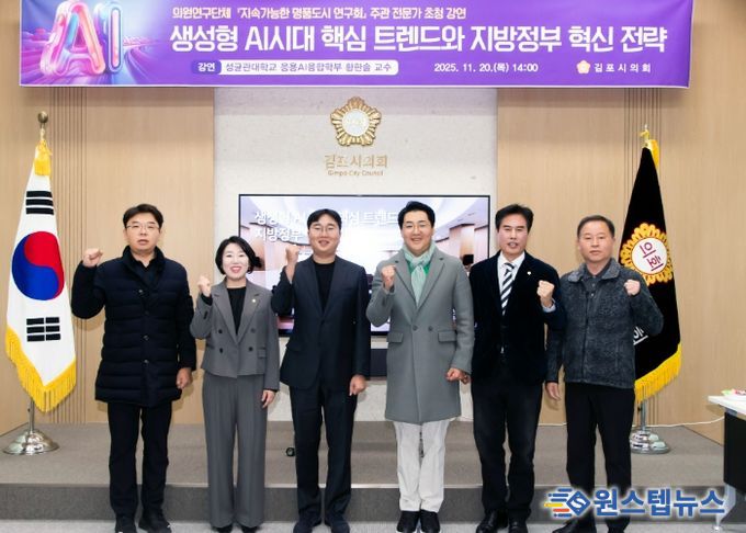 원스텝뉴스 이병희 기자 | 김포시의회 의원 연구단체인‘지속가능한 명품도시 연구회’는 최근 시의회 브리핑룸에서 ‘생성형 AI 시대 핵심 트렌드와 지방정부 혁신 전략’을 주제로 전문가 초청 강연을 열었다고 밝혔다.