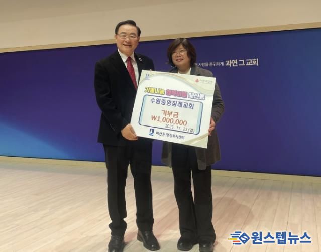 원스텝뉴스 이병희 기자 | 수원중앙침례교회가 지난 23일, 지역 내 어려운 이웃을 돕기 위해 매산동 지역사회보장협의체 사회복지공동모금회 계좌로 성금 100만 원을 기탁했다.