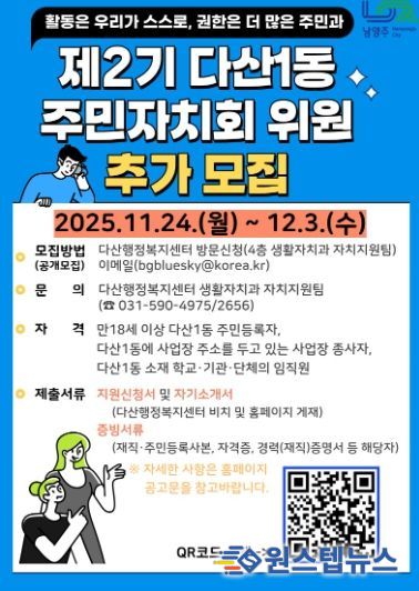 원스텝뉴스 이병희 기자 | 남양주시는 11월 24일부터 12월 3일까지 다산행정복지센터가 ‘다산1동 제2기 주민자치회’ 위원 10명을 추가 공개 모집한다고 밝혔다.