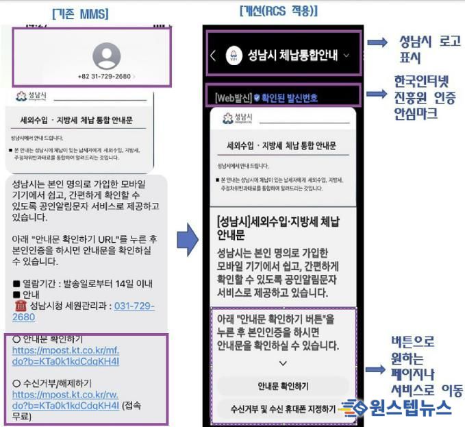 원스텝뉴스 이병희 기자 | 성남시는 이달부터 차세대문자서비스(RCS: Rich Communication Service)를 도입해 체납통합안내 문자 서비스의 신뢰성과 보안성을 한층 강화했다고 밝혔다.