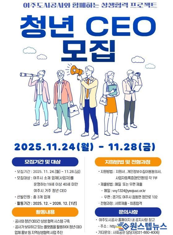 이번 모집은 여주시 소재 업체를 운영하고 있는 19세 이상 40세 미만의 청년 CEO를 대상으로 하며, 총 3개 업체를 선발할 예정이다. 선정된 청년 CEO는 오는 12월부터 내년 12월까지 1년간 공사와 함께 다양한 협력 활동에 참여하게 된다.