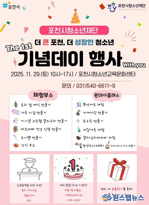 원스텝뉴스 천규영 기자 | 포천시청소년재단은 재단 출범 1주년을 맞아 오는 29일 포천시청소년교육문화센터에서 ‘2025년 포천시청소년재단 1주년 기념행사 – 더 큰 포천, 더 성장한 청소년’을 개최한다.