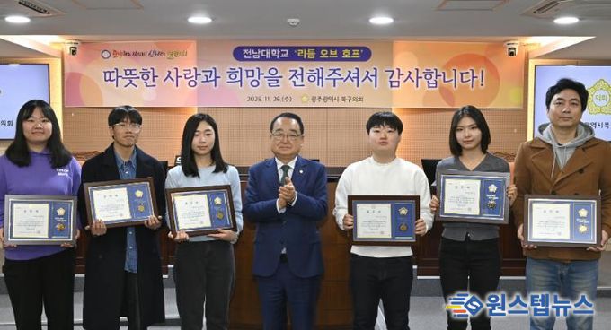 원스텝뉴스 이병희 기자 | 광주 북구의회가 26일 본회의장에서 전남대학교 봉사동아리 ‘리듬오브호프’ 회원 6명에게 의장 표창을 수여했다.