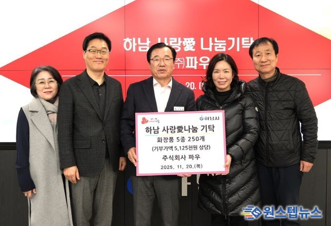 원스텝뉴스 이병희 기자 | 11월 20일 목요일 하남시청에서 ㈜파우 FAU 대표(최미화)는 하남시가족센터에 하남 사랑愛나눔 기탁으로 5,125,000원 상당의 화장품 5종 250개를 지정 기탁했다.