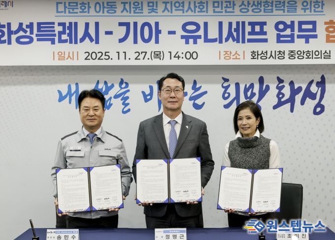 원스텝뉴스 이병희 기자 | 화성특례시가 27일 시청 중앙회의실에서 유니세프 한국위원회, 기아 주식회사와 ‘다문화아동 지원 및 지역사회 민관 상생 협력을 위한 업무협약’을 체결했다.