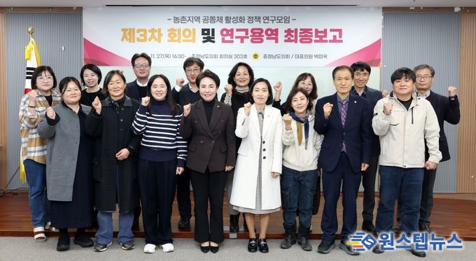 원스텝뉴스 이병희 기자 | 충남도의회 ‘농촌지역 공동체 활성화 정책 연구모임’(대표 박미옥)은 지난 27일 도의회에서 제3차 회의 및 연구용역 최종보고회를 열고, ‘충남형 농촌 서비스 통합모델’ 구축 방향을 심도 있게 논의했다.