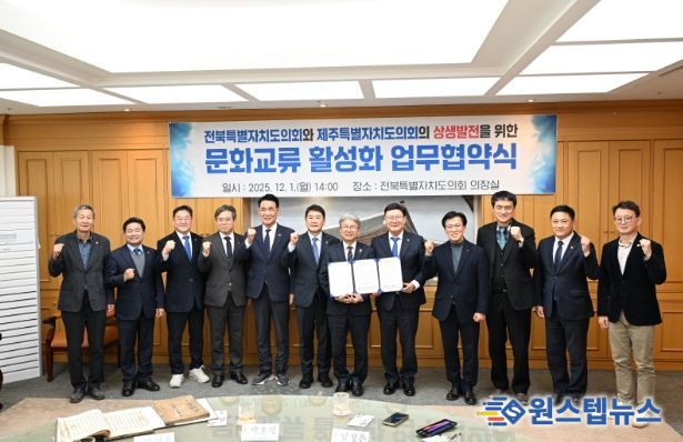 원스텝뉴스 이병희 기자 | 제주특별자치도의회는 12월 1일 오후 14시 전북특별자치도의회 의장실(의장 문승우)에서 전북특별자치도의회와 문화교류 활성화 및 지역 상생발전을 위한 업무협약(MOU)을 체결했다고 밝혔다.