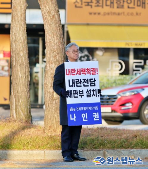 원스텝뉴스 이병희 기자 | 전북특별자치도의회 나인권 의원(김제1)이 1일 김제종합버스터미널 네거리에서 내란전담재판부 설치 및 내란세력 척결을 요구하며 1인 피켓시위에 나섰다.