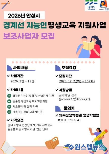 원스텝뉴스 이병희 기자 | 안성시는 관내 경계선 지능인의 진단·학습·가족 지원을 체계화하고 포용적 학습환경을 조성하기 위해 12월 2일부터 16일까지'2026년 경계선 지능인 평생교육 지원사업'을 수행할 보조사업자를 공모한다.