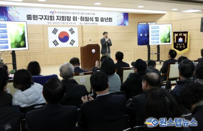 원스텝뉴스 이병희 기자 | 성남시의회는 2일 중원구청 대회의실에서 열린‘한국공인중개사협회 중원구지회 송년회’에 참석했다. 이날 행사는 한 해의 활동을 정리하고 새로운 출발을 다짐하는 자리로, 개회 선언과 국민의례를 시작으로 내외빈 소개, 지회장 이·취임식, 표창장 수여 등이 차례로 진행됐다.