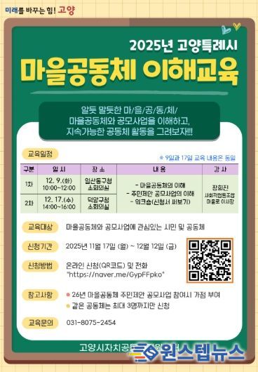 원스텝뉴스 이병희 기자 | 고양특례시는 시민들의 마을공동체 활동에 대한 이해도와 참여를 높이기 위해 오는 12월 9일과 17일, 두 차례에 걸쳐 ‘2025년 마을공동체 이해교육’을 진행한다고 밝혔다.