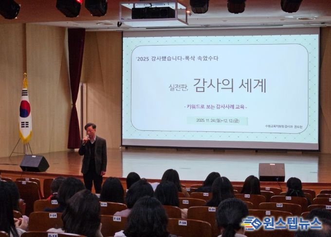 원스텝뉴스 이병희 기자 | 경기도수원교육지원청은 12월 3일 관내 학교와 소속 직원을 대상으로 ‘감사(監査)했습니다–폭삭 속았수다’ 공연연계형 감사사례교육을 운영했다. 이번 교육은 지난해에 이어 2년 연속 수원시립예술단의 찾아가는 예술무대와 협력해, 한 해 동안 감사와 업무에 힘쓴 교직원과 직원을 격려하고자 마련됐다.