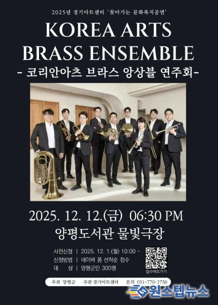 원스텝뉴스 천규영 기자 | 양평군은 지역 주민에게 품격 있는 문화 향유 기회를 제공하고자 오는 12월 12일 양평도서관 물빛극장에서 ‘연말 맞이 찾아가는 문화복지 공연’을 개최한다고 밝혔다.