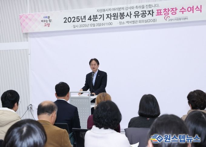원스텝뉴스 이병희 기자 | 고양시자원봉사센터는 지난 3일 고양시청 백석 별관에서 ‘2025년 4분기 자원봉사 유공자 표창장 수여식’을 개최했다고 밝혔다.