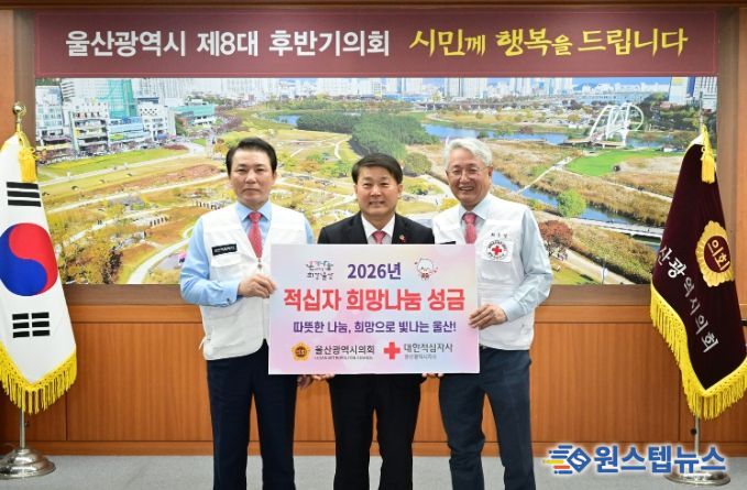 원스텝뉴스 이병희 기자 | 울산광역시의회는 4일 오전, 의장실에서 대한적십자사 울산지사에 2026년도 적십자회비를 전달하며 지역사회 나눔문화 확산에 동참했다