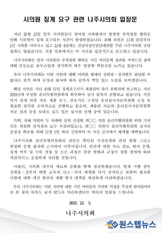 원스텝뉴스 이병희 기자 | 나주시의회는 지난 10월 15일 일부 시의원들이 참여한 카카오톡 대화방에서 발생한 부적절한 행위로 징계 요구가 제기되고, 피해 의원의 1인 시위와 여성단체 규탄 집회, 언론 보도가 이어진 상황과 관련하여 12월 5일 공식 입장문을 발표했다.