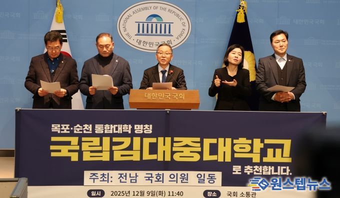 원스텝뉴스 이병희 기자 | 전남 지역 국회의원들이 9일 오전 11시 40분 국회 소통관에서 기자회견을 열고 국립목포대와 국립순천대 통합대학의 교명으로 ‘국립김대중대학교’를 공식 제안했다.