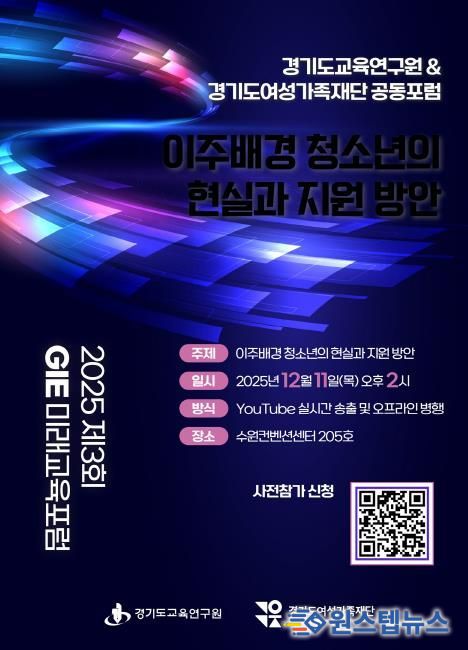 원스텝뉴스 이병희 기자 | 경기도여성가족재단이 11일 오후 2시 수원컨벤션센터에서 ‘이주배경 청소년의 현실과 지원방안’을 주제로 경기도교육연구원과 공동포럼을 개최한다.