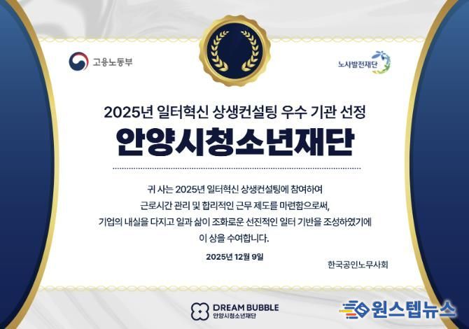 원스텝뉴스 이병희 기자 | 안양시청소년재단은 고용노동부가 주관한 2025년 일터혁신 상생컨설팅에 참여해 근로시간 관리 체계 개선과 합리적 근무제도 마련을 통해 우수 기관으로 선정됐다.
