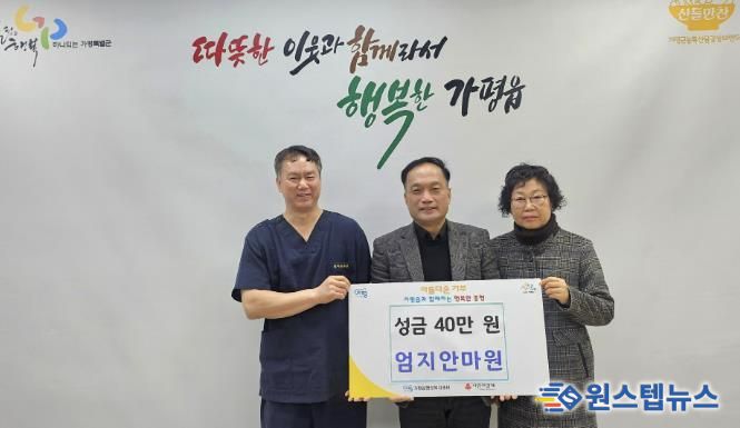 원스텝뉴스 이병희 기자 | 가평군에 소재한 엄지안마원은 최근 가평읍 행정복지센터를 방문해 이웃돕기 성금 40만 원을 기탁했다.