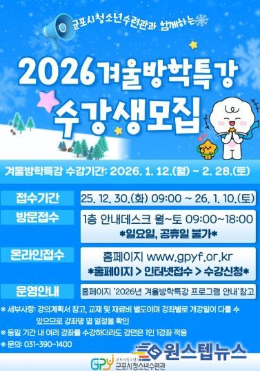 원스텝뉴스 천규영 기자 | (재)군포시청소년재단 군포시청소년수련관은 2026년 1월 12일부터 2월 28일까지 겨울방학을 맞아 문화·체육 분야 겨울방학특강 프로그램을 운영한다.