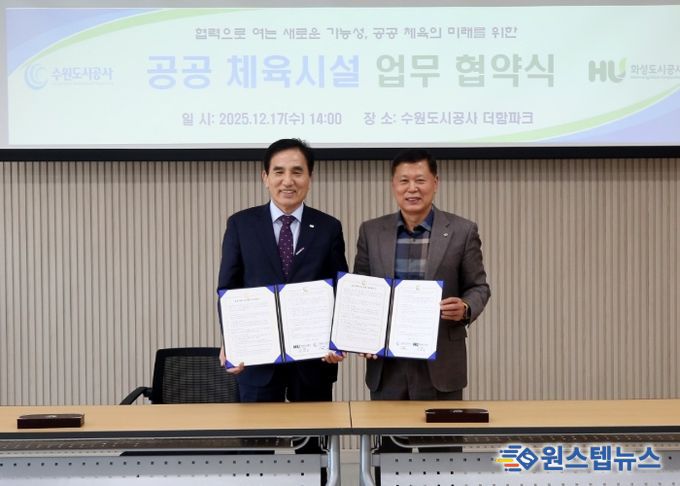 원스텝뉴스 이병희 기자 | 화성도시공사는 12월 17일 오후 2시, 수원도시공사 더함파크 3층에서 수원도시공사와 함께 공공 수영시설 강사운영 안정화를 위한 '공공 수영시설 협의체 업무협약(MOU)'을 체결했다고 밝혔다.