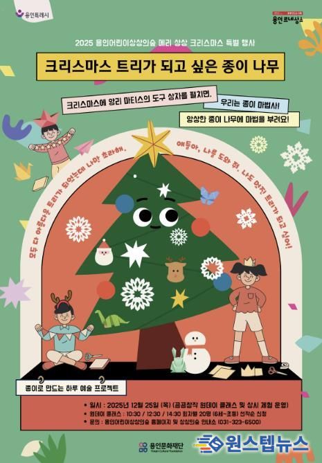 원스텝뉴스 천규영 기자 | 용인문화재단은 오는 12월 25일에 크리스마스를 맞아 용인어린이상상의숲과 용인문화도시플랫폼 공생광장 일원에서 다양한 문화예술 프로그램을 즐길 수 있는 크리스마스 특별행사를 개최한다.