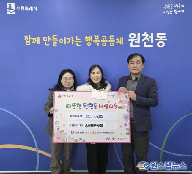 원스텝뉴스 이병희 기자 | 지난 18일, 원천동에 소재한 송이비인후과는 지역사회 나눔 실천의 일환으로 원천동행정복지센터에 성금 50만 원을 기부했다.