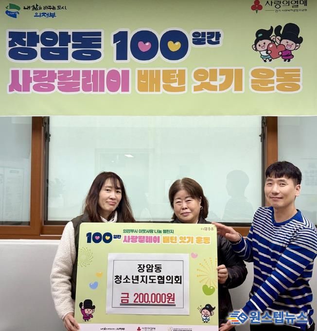 원스텝뉴스 이병희 기자 | 의정부시 장암동주민센터는 12월 17일 장암동 청소년지도협의회가 취약계층을 돕기 위한 성금 20만 원을 기탁했다고 밝혔다.