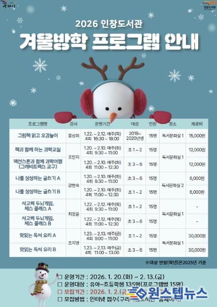인창도서관은 1월 20일부터 2월 13일까지 초등 문해력 향상을 위한 글쓰기 수업 ‘나를 상상하는 글쓰기’를 비롯해, 책 읽기를 통해 과학 원리를 배우는 ‘책과 함께하는 과학 교실’, 그래비트랙스 교구를 활용한 ‘액션스톤과 함께 과학여행’, ‘체스클래스’, ‘맛있는 독서 요리’ 등 다양한 특강 프로그램을 운영해 따뜻한 겨울방학 학습의 기회를 제공한다.
