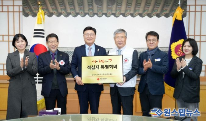 원스텝뉴스 이병희 기자 | 전북특별자치도의회 문승우 의장(군산4)은 19일 의장실에서 대한적십자 전북특별자치도지사 김홍식 회장에게 적십자 특별회비를 전달했다.
