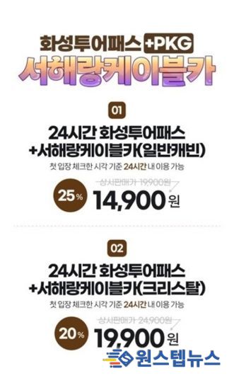‘화성투어패스 + 서해랑케이블카 PKG권’은 화성투어패스 이용권을 구매하면 서해랑케이블카 크리스탈 캐빈이나 일반 캐빈을 무료로 이용할 수 있는 상품으로, 이벤트 기간 동안은 기존 가격 대비 5천 원 할인해 판매한다.