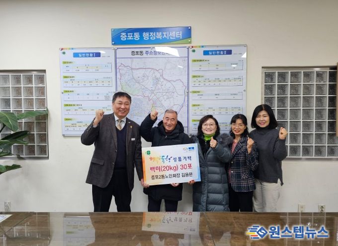 원스텝뉴스 이병희 기자 | 이천시 증포동은 지난 12월 19일 증포동행정복지센터에서 증포2통 노인회 김용문 회장이 관내 취약계층을 위해 백미(20kg) 30포를 기탁했다고 밝혔다.