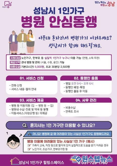 원스텝뉴스 이병희 기자 | 성남시는 ‘1인 가구 병원 안심 동행 서비스’ 추진을 위해 전문 인력을 기존 4명에서 5명으로 늘렸다고 22일 밝혔다.