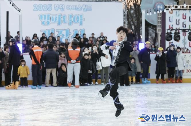 원스텝뉴스 이병희 기자 | 부천시는 지난 19일, 부천종합운동장 잔디광장에 새롭게 조성된 ‘부천 아이스월드 빙파니아’의 개장식을 열었다. 이날 행사에는 부천시 피겨스케이팅 유망주 이윤호 선수의 축하 공연과 시민 대상 무료 스케이팅 체험이 함께 진행돼, 개장을 기다려온 시민들의 발걸음이 이어졌다. 빙판 위를 밝히는 조명과 경쾌한 음악이 어우러져, 현장은 마치 겨울 축제가 열린 듯 활기찬 분위기로 가득 찼다.