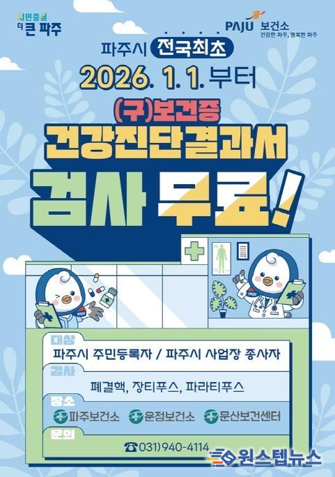 원스텝뉴스 이병희 기자 | 파주시가 시민들의 보건 의료 접근성을 획기적으로 높이고 지역사회 감염병 예방에 앞장서기 위해 전국 지방자치단체 최초로 건강진단결과서(구 보건증) 발급 수수료를 전면 무료화한다.