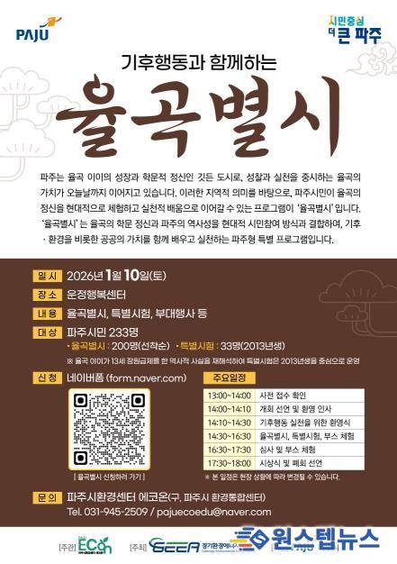 원스텝뉴스 이병희 기자 | 파주시환경센터 ‘에코온’은 파주를 대표하는 조선시대 사상가 율곡 이이의 학문 정신을 현대적 기후행동 가치로 재해석한 기후문화축제 ‘기후행동과 함께하는 율곡별시’를 오는 내년 1월 10일 운정행복센터에서 개최한다.