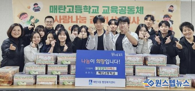 원스텝뉴스 이병희 기자 | 매탄고등학교는 지난 19일, 교사·학생·학부모가 함께 참여해 마련한 김장김치 26박스를 매탄3동행정복지센터에 전달하며 지역사회에 따뜻한 나눔을 실천했다.