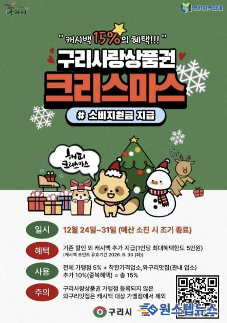 원스텝뉴스 이병희 기자 | 구리시는 12월 24일부터 ‘구리사랑상품권 크리스마스 소비 지원금’을 지급한다고 밝혔다. 이번 소비 지원금은 연말연시 기간 지역 외로 유출되는 소비를 지역 내로 유도하고, 관내 상권 활성화와 소상공인 보호를 위해 마련됐으며, 예산 소진 시 조기 종료될 수 있다.
