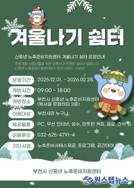 이소영 부천시 돌봄지원과장은 “겨울나기 쉼터는 시민들이 추위를 피해 따뜻하게 머물며 이웃과 자연스럽게 마주하고 소통할 수 있는 공간”이라며 “쉼터 이용이 노후준비 상담과 교육 등 다양한 서비스로 이어질 수 있도록 운영해 나가겠다”고 말했다.